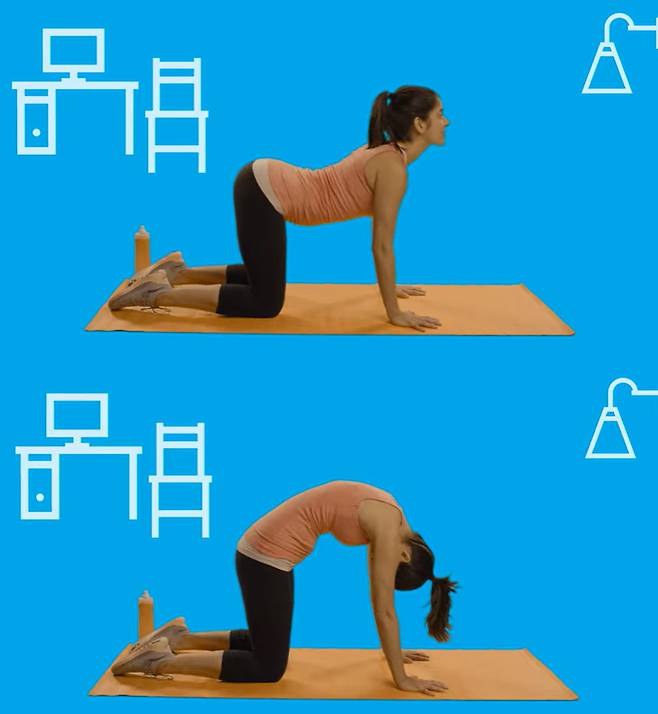 1. 손과 무릎을 바닥에 대고 어깨너비로 벌려 테이블 자세를 만든다.