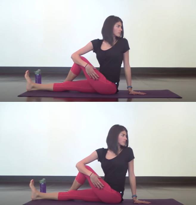 3. 세운 다리와 같은쪽 팔을 등 뒤에 짚고 반대 팔로 세운 다리를 밀어내며 몸을 돌려준다.