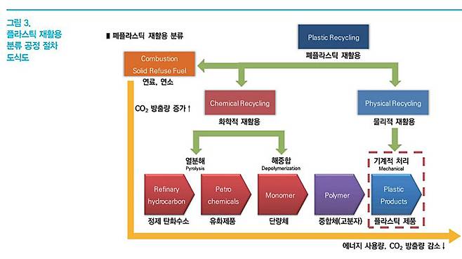 화학적 재활용을 통한 플라스틱 리사이클 공정은 소재를 원재료 수준의 물성으로 구현하여 제품을 만들 수 있는 장점이 있지만, 위의 도식도에 표현한 것처럼 물리적 처리 방식 대비 가공에 필요한 절차가 많아 공정 운용에 따른 비용과 이때 발생하는 CO2량을 고려하면 실질적으로는 LCA에 불리하다는 지적도 있는 상황이다.
