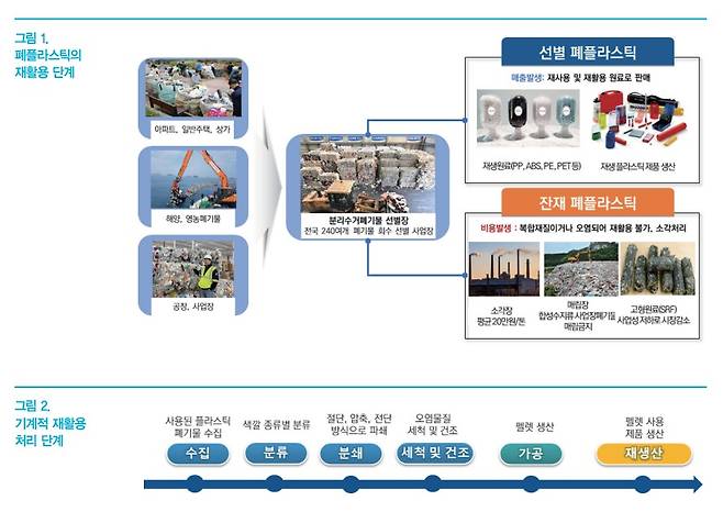 용도를 다한 폐플라스틱은 매립, 소각 또는 분리수거를 통해 폐기 처리 단계를 거치며, 이때 화학적 재활용(CR), 물질 재활용(MR), 에너지 재활용을 통하여 플라스틱의 재활용 처리가 수행된다.