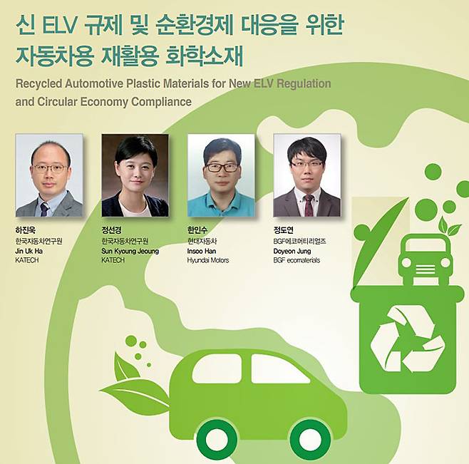 자동차 폐차 유례 플라스틱을 확보하는 과정도 녹록치는 않다. 우선은 최근 국내의 폐차 상황이 차량을 국내에서 폐차하기 보다는 해외로 수출하는 경우가 늘어 국내 폐자동차의 수량이 감소하고 있는 점을 들 수 있다. 기술적으로는 자동차에 사용되는 플라스틱은 단일 소재로 사용되기 보다는 특성이 맞게 부품별로 다른 소재가 혼합되어 사용되는 경우가 많으며, 그 밖에도 앞서 언급한 것처럼 코팅 및 도장과 같이 표면처리가 된 경우가 많기 때문에 손쉽게 재활용 플라스틱을 확보할 수는 없다. 흔히 생각할 수 있는 PP 소재를 사용한 범퍼의 경우 대부분의 차량에 도장이 되어 있기 때문에, 별도의 처리공정이 필요하며, 헤드램프에 사용되는 PC의 경우도 낮은 내스크래치 특성을 보강하기 위해 적용된 표면 코팅을 제거해야 한다. 내외장 부품에 많이 사용된 PC/ABS, PC/PBT, PC/PET와 같은 알로이 소재의 경우에는 도