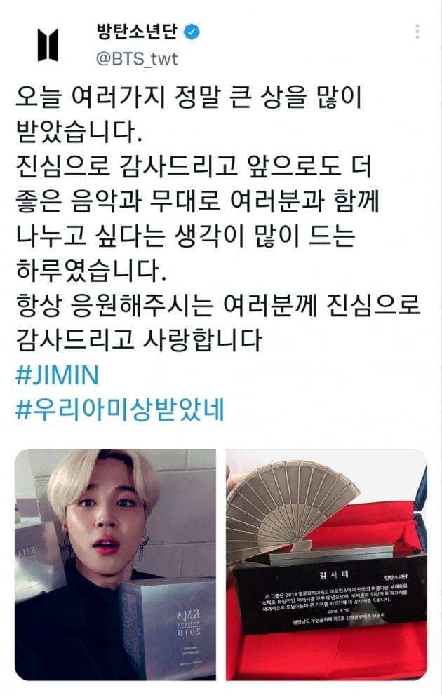 이 무대는 부채춤과 한복 등 우리 고유의 아름다움을 전 세계에 알려 '국보급 퍼포먼스'라는 극찬과 함께 당시 SNS를 강타하는 엄청난 화제를 일으켰으며, 이후 지민은 평안남도 무형문화재 제3호 김백봉 부채춤 보존회로부터 감사패를 전달받아 자신뿐만 아니라 팀 전체에 특별한 영광을 가져다 줬다.