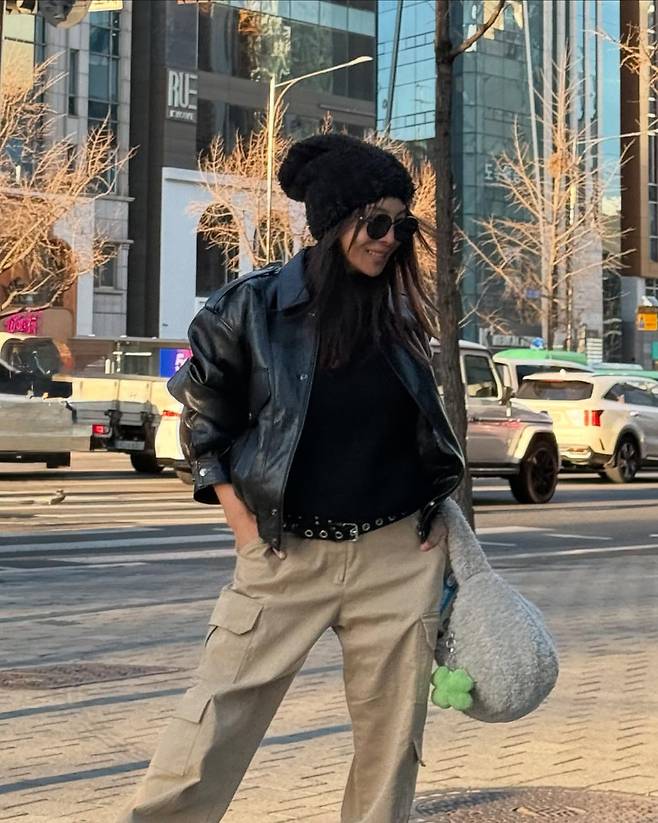 블랙 레더 재킷과 베이지 카고 팬츠를 조합해 스트리트 감성을 담은 스타일을 보여줬다. 실버 장식이 돋보이는 벨트로 허리를 강조하며 디테일에 신경 썼다. 여기에 니트 비니와 텍스처감 있는 그레이 백으로 개성을 더하고, 전체적으로 자유로운 도시적 매력을 드러냈다.