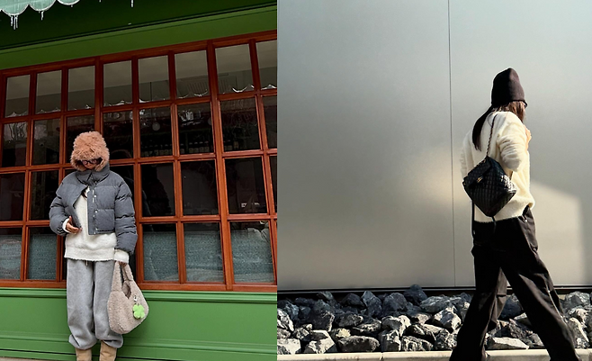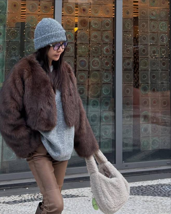 브라운 퍼 코트를 활용한 우아한 겨울 룩을 선보였다. 그레이 니트와 브라운 팬츠를 매치해 톤온톤 스타일링을 완성했으며, 텍스처가 독특한 아이보리 컬러의 가방으로 포인트를 줬다. 비니와 선글라스를 더해 캐주얼하면서도 고급스러운 느낌을 강조했다.