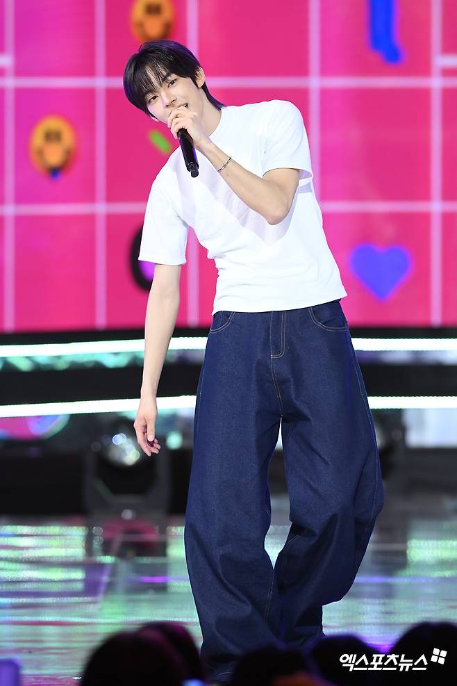 이날 더쇼 생방송에 참석한 투어스(TWS) 도훈이 1위 더쇼 초이스를 수상한 뒤 앵콜 무대를 펼치고 있다.