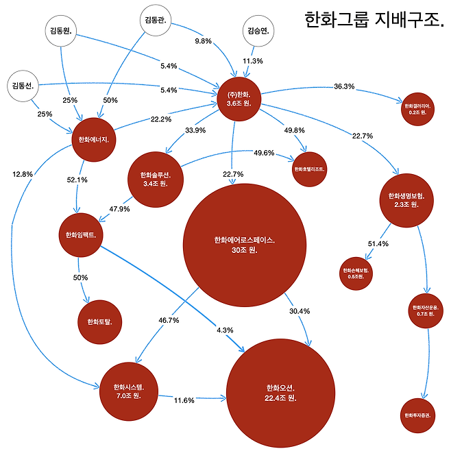 - 둘째, 김동관(한화 부회장) 등 삼형제가 100% 지분을 보유하고 있는 한화에너지의 그룹 지배력이 강화됐다. 옥상옥 지주회사 구조다.