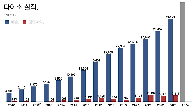 - 2023년 매출이 3조4605억 원, 지난해 실적은 아직 공개되지 않았지만 4조 원을 넘었을 거라는 관측이 지배적이다. 영업이익률이 7~8% 수준이다.