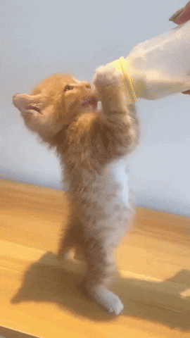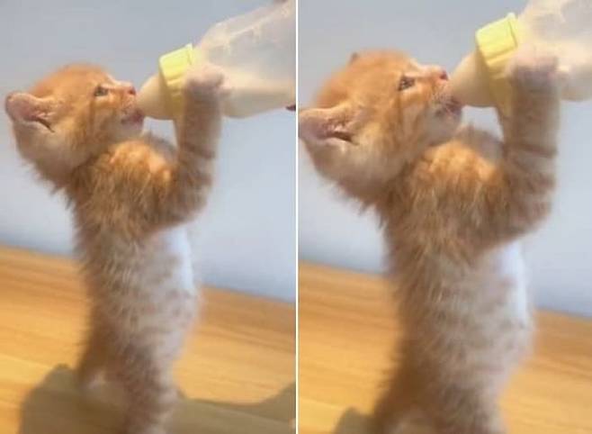 사연은 이렇습니다. SNS상에는 배가 무척이나 고팠는지 집사가 챙겨서 내밀어준 우유병을 보더니 본능적으로 제자리에서 일어선 아기 고양이의 먹방이 올라온 것.