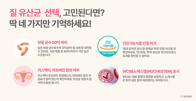 또한 식약처에서 인정한 ‘질 내 유익균 증식 및 유해균 억제’ 기능성 인증 마크가 있는지도 중요합니다. 흔히 제품에 표기된 ‘질 유래 유산균’, ‘질 특허 유산균’ 등의 문구만 있다면 질 건강 기능성을 확인하지 않은 제품일 가능성이 커요.