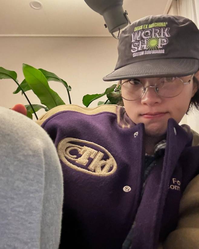 두 번째 사진에서 배우 이수경은 보라색과 베이지색이 조화를 이루는 레터링 자켓을 착용하며 편안하면서도 개성 있는 스타일을 연출하고 있다. 자켓의 레터링 디테일과 스냅 버튼이 스포티한 분위기를 강조하며, 모자와 함께 매치해 자연스러운 일상 패션을 완성했다. 실내 식물과 어우러진 배경은 그녀의 여유로운 일상을 담아내며 스타일에 생동감을 더한다.