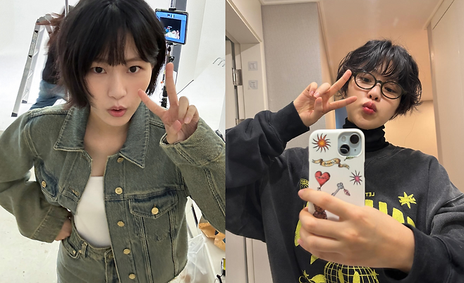세 번째 사진에서는 데님 재킷과 데님 스커트를 매치해 빈티지하면서도 현대적인 느낌을 연출했다. 재킷의 골드 버튼 디테일이 포인트가 되어 심플한 화이트 이너와 함께 스타일을 완성한다. 촬영 현장으로 보이는 배경과 자연스러운 포즈는 그녀의 활동적인 면모를 잘 보여준다.