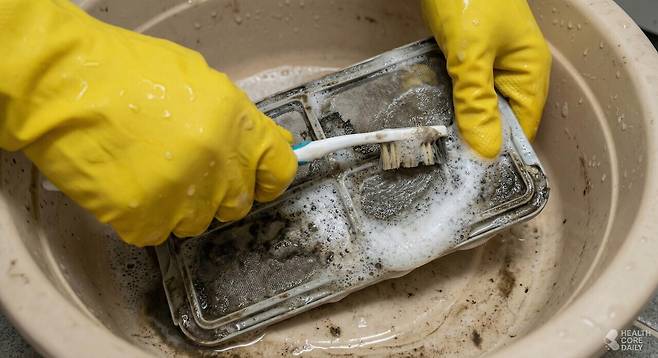 이물질은 오래된 칫솔로 문질러 제거하고, 물로 충분히 헹군다. 청소가 끝나면 필터를 다시 단단히 끼워야 물이 새지 않는다.
