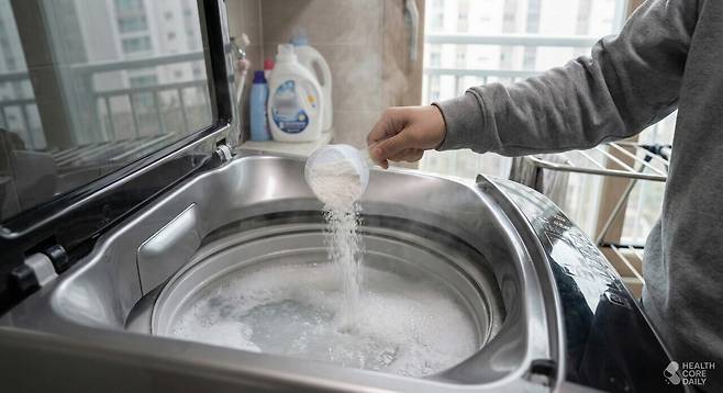 먼저 세탁기 안에 60도 정도의 따뜻한 물을 가득 받는다. 찬물보다는 온수가 찌든 때와 세균 제거에 효과적이다. 물을 받은 후에는 베이킹소다와 과탄산소다를 1:1로 섞어 총 500g 정도 넣는다. 둘 다 친환경 세제로, 세탁조 안쪽에 붙은 묵은 때를 녹이는 데 도움이 된다.