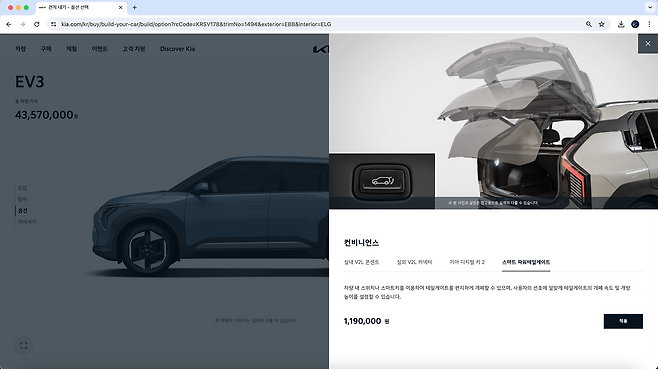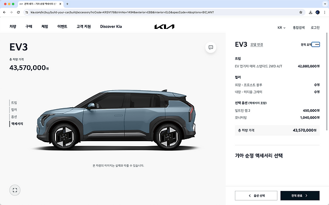 (세제 혜택이 적용되면) 에어 스탠다드에 빌트인 캠과 모니터링 팩을 추가한 3000만 원 중반의 EV3. 걷어내고 걷어낸 결과 어떤가요?