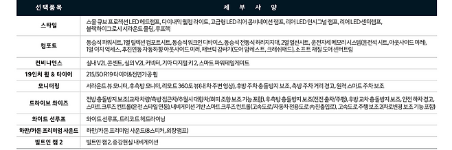세 번째부터는 꼭 필요한 건 아니에요. 그래도 굳이 우선순위를 따져보자면 스타일, 컴포트, 드라이브 와이즈, 하만/카돈 프리미엄 사운드, 컨비니언스, 헤드업 디스플레이. 19인치 휠이랑 와이드 선루프는 필요 없을 것 같아요.
