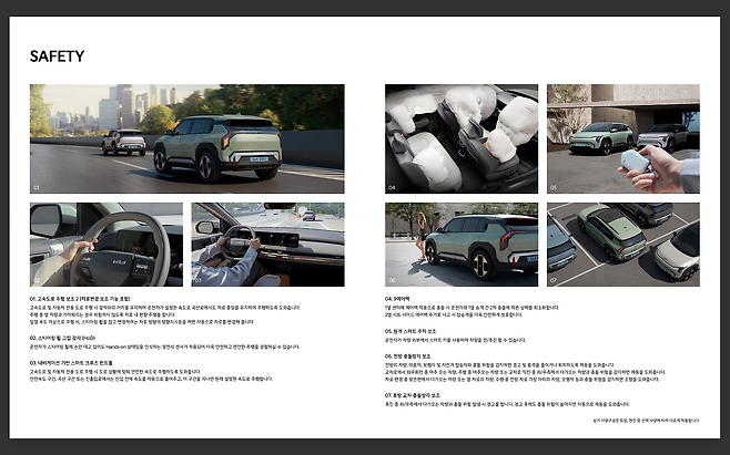 안전에도 신경을 쓴 것 같아요. 에어백은 총 9개로 아이오닉 5보다 하나 더 많이 들어가요. 그리고 초고장력 핫스탬핑 부품이 많이 적용됐고, 충돌 상황에서 에너지가 분산될 수 있도록 차체 전방 구조물을 최적화하는 동시에 측면부 주요 소재와 구조도 보강했다는 게 제조사의 설명.