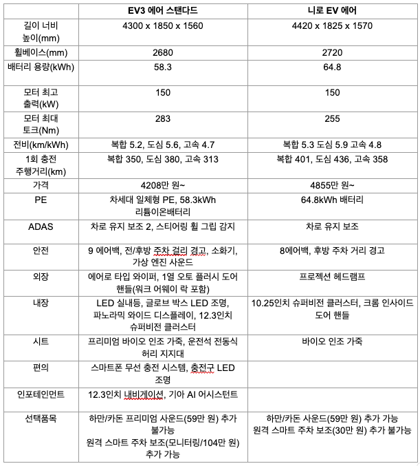 크기랑 공간이 비슷한 두 전기차의 가장 큰 차이는 플랫폼이에요. EV3는 전기차 전용 플랫폼 E-GMP 기반에 4세대 배터리가 들어가는 반면 니로 EV는 내연기관을 토대로 만든 전기차입니다. 새로운 파워 일렉트릭 시스템과 4세대 배터리가 들어가고 ADAS를 비롯해 안전, 실내외, 시트, 편의, 인포테인먼트 구성도 더 나아진 EV3. 가격도 니로 EV보다 저렴합니다. EV3 에어 롱레인지(4650만 원)도요.