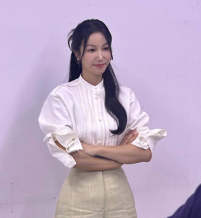 스튜디오에서 촬영된 화이트 블라우스 룩에서는 단정하면서도 세련된 매력을 보여주고 있다. 프릴 디테일이 돋보이는 화이트 셔츠와 베이지 톤의 하의를 조합해 깔끔하고 우아한 분위기를 연출했으며, 팔짱을 낀 포즈로 자신감 있는 모습을 표현하고 있다.