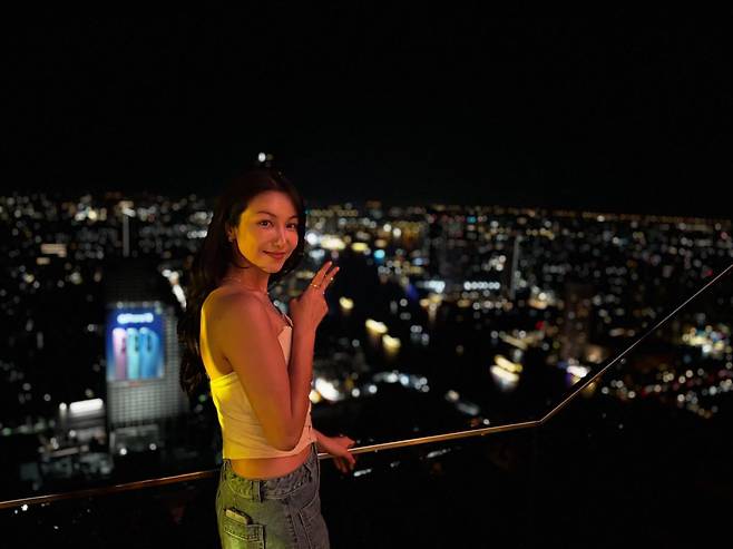 김옥빈은 도심의 화려한 야경을 배경으로 옐로우 톤의 크롭 탑과 연청색 데님 팬츠를 매치해 트렌디한 캐주얼룩을 연출하고 있다. 크롭 탑의 밝은 컬러는 야간 조명과 어우러져 생동감 있는 분위기를 자아내며, 슬림핏 데님과의 조합으로 젊고 활기찬 이미지를 완성했다.