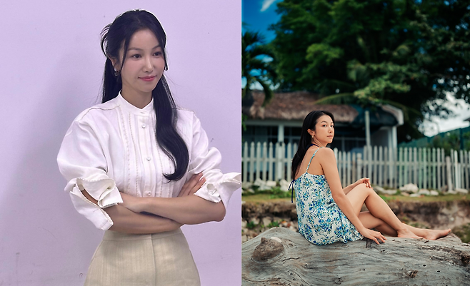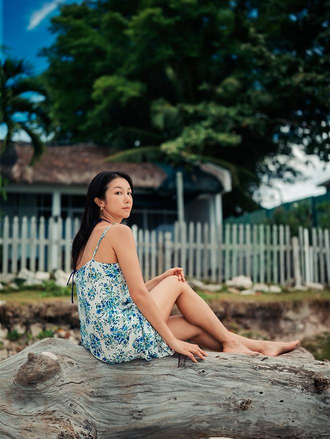 해변가에서 포착된 모습에서는 블루 톤의 플로럴 패턴 원피스로 상큼한 여름 분위기를 연출하고 있다. 홀터넥 스타일의 원피스는 어깨선을 깔끔하게 살려주며, 자연스러운 포즈와 함께 편안하면서도 로맨틱한 무드를 완성했다.