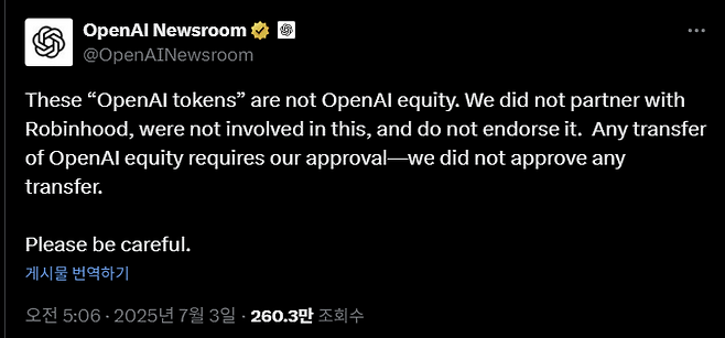 오픈AI는 2일(현지시간) 소셜미디어 엑스(X)를 통해 "'오픈AI 토큰'은 오픈AI 주식이 아니다. 오픈AI는 로빈후드와 파트너십을 맺지 않았고, 이에 관여하지 않았으며 지지하지도 않는다"라고 부인했다.