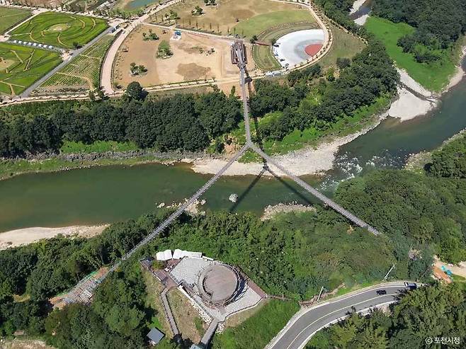 길이 410m로 국내 최장 규모를 자랑하는 이 출렁다리는 무주탑 형태로 지어져 자연경관을 최대한 살렸으며, 다리 위에서는 유네스코 세계지질공원으로 지정된 한탄강 주상절리 협곡을 발아래로 감상할 수 있다.