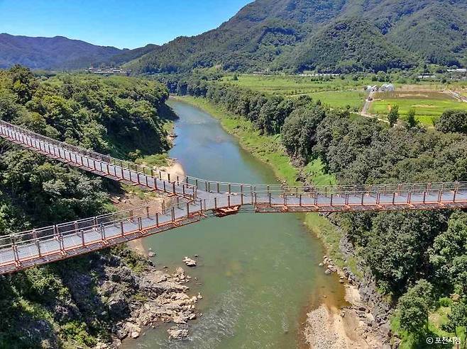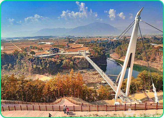 출렁다리 위에 서면 탁 트인 협곡이 한눈에 들어온다. 용암이 굳어 만들어진 기암절벽과 푸른 강물이 조화를 이루는 풍경은 마치 자연이 빚어낸 거대한 예술작품과도 같다.