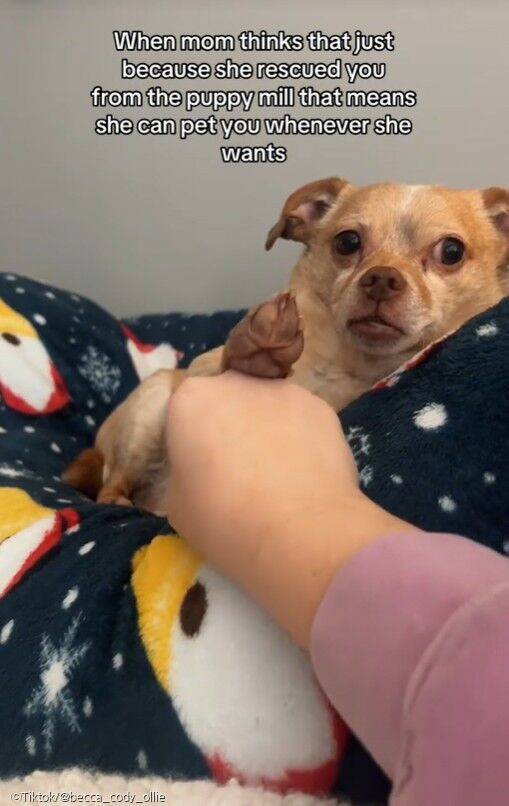 그러자 코디는 고개를 들어 엄마를 바라보더니 앞발로 엄마의 손을 밀어내는 모습입니다. 마치 혼자만의 시간을 방해하지 말라는 듯 정중하게 거절하는 듯한 모습이 웃음을 자아내는데요.