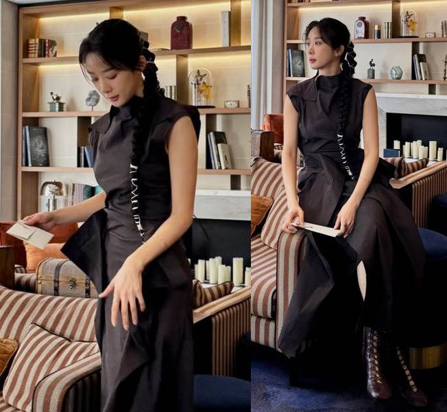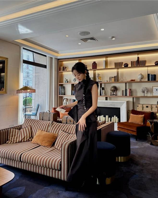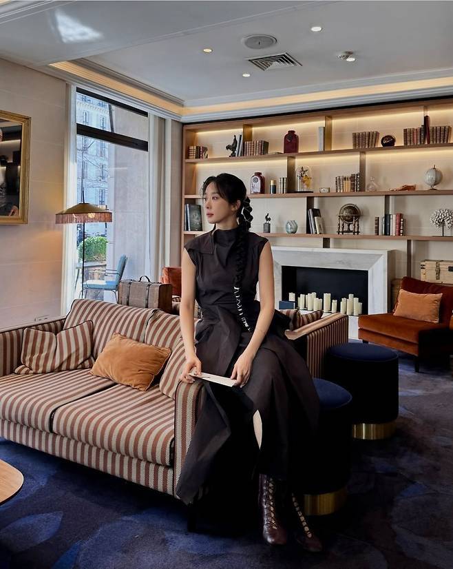 특히 레이스업 디테일이 있는 부츠를 매치해 클래식하면서도 시크한 느낌을 더한 것이 포인트로, 따뜻한 톤의 인테리어와 어우러진 올블랙 스타일링이 프렌치 시크 무드를 완벽하게 완성했습니다.