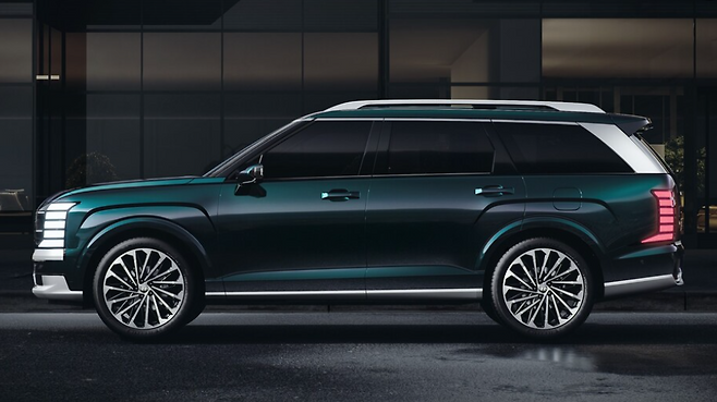 차세대 팰리세이드가 지닌 또 하나의 헤리티지는 '휠 아치 라인'이다. 이전 세대와 동일하게 측면부에 기교로운 캐릭터 라인을 그려내지 않았고, 휠 하우스의 상단부근에 두꺼운 주름을 각인함으로써 단단하고 역동적인 분위기를 연출했다. 이전 세대나 차세대 모델이나 팰리세이드의 훌륭한 캐릭터가 되어주는 것 같다. 그 외 특징이라면 측면에서도 전/후면 데이라이트의 그래픽이 동일하다는 점, 그리고 전면 범퍼 하단부의 크롬 가니시가 측면을 거쳐 리어 범퍼에도 연결된다는 점이 있다. 휠은 21인치 크기로 익숙한 멀티 스포크 디자인이다.