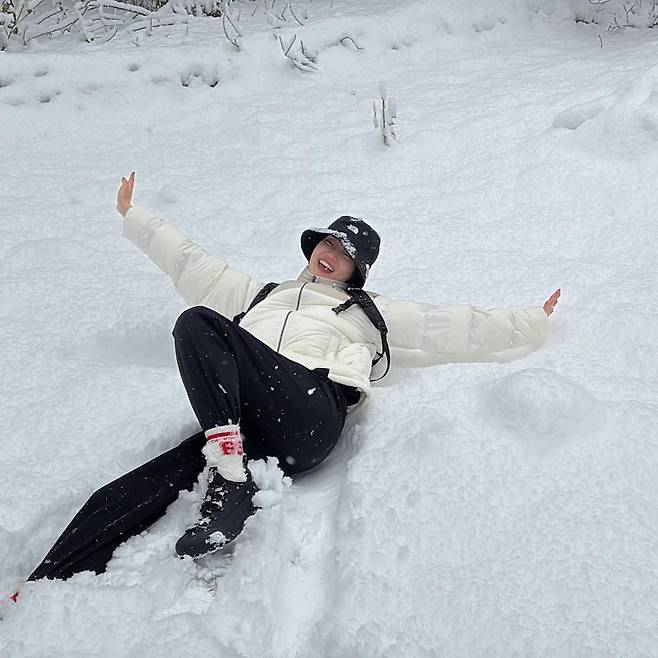 눈 덮인 풍경 속에서 화이트 패딩과 버킷햇을 활용해 스포티하면서도 귀여운 겨울 패션을 선보였다. 화이트와 블랙의 대비가 깔끔한 인상을 주며, 활동적인 포즈와 밝은 미소가 룩에 생기를 불어넣는다. 특히, 레드 디테일이 들어간 양말은 전체적인 스타일에 포인트를 더한다.