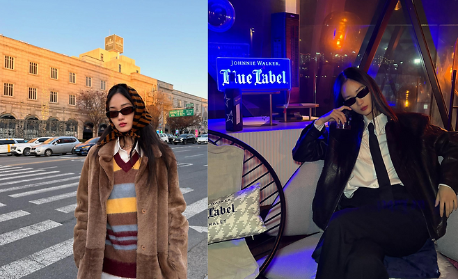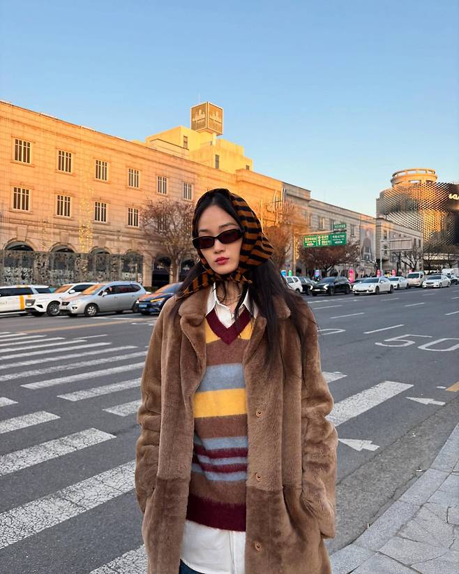 세 번째 사진에서는 스트라이프 니트와 퍼 코트를 활용해 따뜻하고 빈티지한 감성을 연출했다. 머리에 두른 호피 패턴 스카프는 레트로 분위기를 강조하며, 브라운 퍼 코트는 고급스러움을 더한다. 여기에 캐주얼한 니트와 셔츠 레이어링으로 편안하면서도 스타일리시한 느낌을 완성했다.