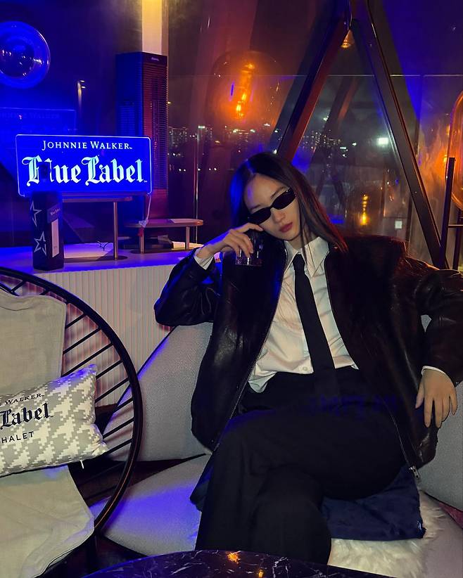 블랙 수트와 가죽 재킷을 활용해 강렬하면서도 시크한 매력을 발산했다. 화이트 셔츠와 넥타이를 더해 포멀함을 유지하면서도, 선글라스를 착용해 자유로운 감각을 더했다. 배경의 네온 사인은 룩에 현대적인 감성을 더하며, 그녀의 자신감 넘치는 자세가 스타일을 더욱 돋보이게 한다.