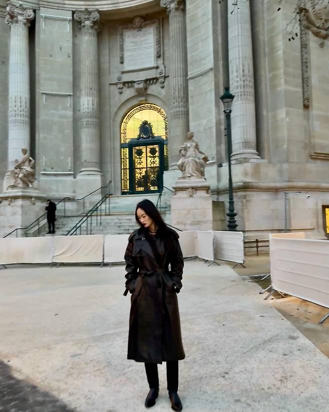 신현지는 고풍스러운 건축물을 배경으로 블랙 트렌치코트를 착용해 세련된 분위기를 연출했다. 트렌치코트의 매끈한 실루엣과 올블랙 스타일링은 도시적이면서도 우아한 느낌을 준다. 여기에 심플한 블랙 슈즈를 매치해 전체적인 통일감을 더했다. 그녀의 자연스러운 포즈는 클래식한 무드를 한층 돋보이게 한다.