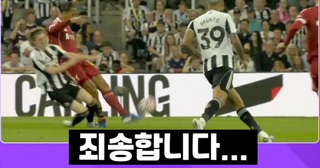 경기의 승패를 가른 결정적인 순간은 전반 종료 직전 나왔습니다. 전방 압박을 시도하던 고든이 반 다이크에게 태클을 걸었고, 그의 발이 반 다이크의 종아리로 향하며 주심은 비디오 판독(VAR) 끝에 다이렉트 퇴장을 선언했습니다.