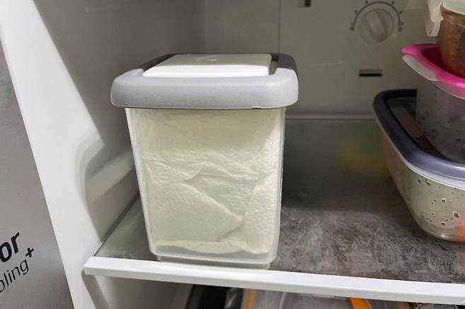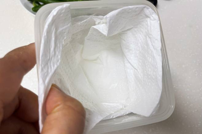 수분 제거를 위해 보관할 통에도 키친타월을 깔아주세요. 그냥 보관할 때보다 키친타월이 수분을 잡아 더 오래간답니다.