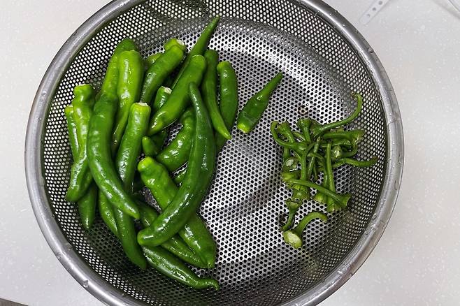 그다음 깨끗이 씻은 고추의 꼭지를 제거해 줍니다. 꼭지가 달려 있으면 후숙 속도가 빨라져 더 빨리 상할 수 있으니 보관 전 다 제거해 주세요.