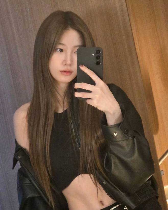 르세라핌 카즈하가 공개한 거울 셀카가 단숨에 시선을 사로잡았다. 깔끔한 우드톤 배경 앞에서 촬영된 이번 사진은 카즈하 특유의 청순한 비주얼과 대비되는 시크한 블랙 룩으로 강렬한 인상을 남긴다. 특히 오버핏 레더 재킷과 크롭탑, 그리고 벨트 디테일이 살아 있는 팬츠 조합은 카즈하의 슬림한 실루엣을 더욱 돋보이게 하며, 2025년 봄 스트리트 패션 트렌드를 완벽하게 소화했다.