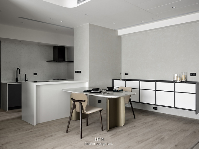 요리 공간 벽면에는 독특한 무늬와 모공이 없는 규산강석을 적용해 남편의 까다로운 미적 감각을 만족시켰다. 다이닝룸은 입구 쪽에 자리잡고 있지만 바닥 구획이 명확해서 열린 느낌을 주면서도 주방과 활발한 소통이 가능하다.