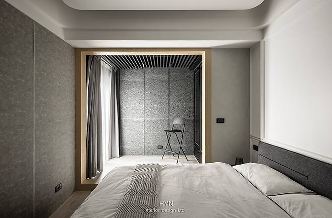 안방에도 액자 모양 디자인이 이어져 목공으로 비스듬히 자른 형태의 현대적인 침대 뒷벽을 완성했다. 킹사이즈 침대 때문에 양쪽이 좁아져서 협탁을 맞춤 제작했는데, 남편과 아내의 성씨 첫 글자인 Z와 S 모양으로 만들어 특별한 의미를 담았다. 목공으로 제작한 검은색과 흰색 협탁이 방 안에서 개성을 드러낸다.