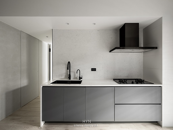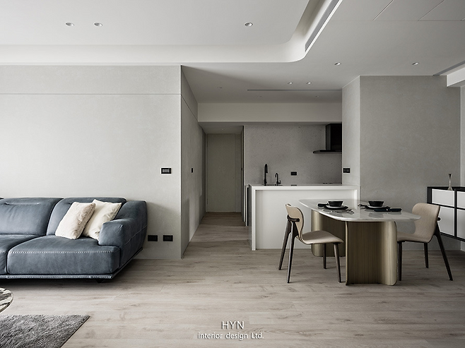 거실에 들어서자마자 시선을 사로잡는 것은 단연 대리석 TV 벽이다. 회색 바탕이 공용 공간 전체에 깔려 있고, 집주인이 처음부터 원했던 대리석 소재가 테두리 없는 형태로 시원하게 펼쳐져 있다. 바닥부터 천장까지 이어지는 석재 마감이 얇은 형태로 적용되어 TV 벽이 한층 깔끔해 보인다.