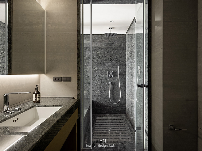 메인 욕실은 어두운 색상의 상판으로 목욕 시간의 촉촉한 분위기를 연출한다. 상판부터 벽면, 바닥까지 모두 짙은 먹색으로 통일했고, 고급 수전 제품을 선택해 사용감까지 깔끔하게 마무리했다. 작은 휴식 공간에서 들어오는 창밖 햇빛이 차가운 것과 따뜻한 것, 어두운 것과 밝은 것이 어우러지는 조화로운 느낌을 준다.
