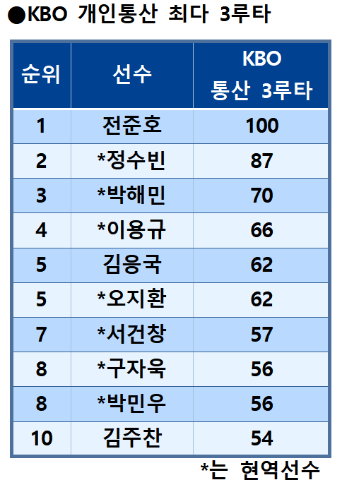 전문에서 설명한 것처럼 KBO 역사상 개인통산 최다 3루타 부문 1위 주인공은 전준호다. 1991년 롯데에 입단한 뒤 현대(1997~2007년)와 히어로즈(2008~2009년)를 거치면서 19년 동안 정확히 3루타 100개 고지를 밟았다. 2008년 10월 3일 목동구장에서 열린 두산전에서 김선우를 상대로 우월 3루타를 뽑아내면서 KBO 최초 100호 3루타의 문을 열었다.