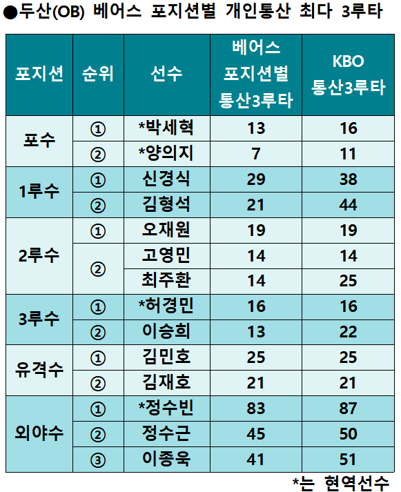 1루수로는 베어스 최초 3루타의 사나이 신경식이 굳건히 1위를 지키고 있다. 그는 베어스에서 1982년부터 1990년까지 9년간 활약하며 개인통산 30개의 3루타를 때렸다. 그중 1루수로 나섰을 때 29개를 뽑아냈다. 1991년 삼성으로 트레이드된 뒤 1995년 쌍방울에서 은퇴할 때까지 12개를 추가해 통산 42개의 2루타를 기록했다.
