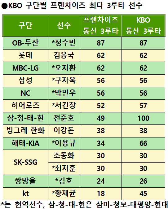 ◆KBO 역대 구단 프랜차이즈 최다 3루타 선수는?