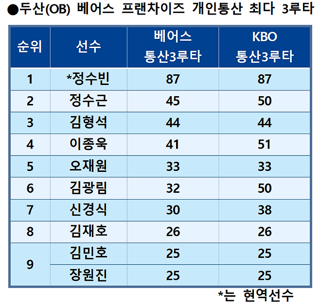 ◆두산 베어스 프랜차이즈 3루타 톱10