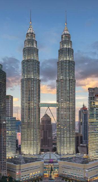 ‘페트로나스 트윈 타워’는 이름에서 알 수 있듯 쌍둥이처럼 꼭 닮은 건물 2개동으로 구성하는 점이 특징이다. 이 두 개 건물을 공중에 떠 있는 하늘다리가 연결하는 구조다. 이슬람 사원을 연상시키면서도 현대 건축의 모더니즘을 조화한 듯한 외관 디자인으로 준공 당시 독특하다는 평가를 받았다. 설계는 아르헨티나 출신 건축가 ‘시저 팰리’(Cesar Pelli)가 맡았다.