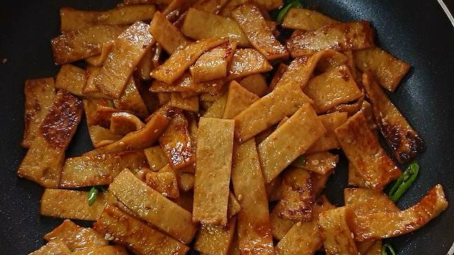 4. 간장이 끓으면 어묵 넣고 볶아주기