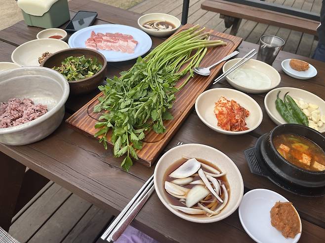 청도 한재미나리를 제대로 즐기고 싶다면, 굽은소나무와오리도둑한재미나리가 좋은 선택이 될 거예요. 이곳은 향긋한 미나리에 삼겹살을 구워 먹는 재미가 일품인데, 산자락 아래 자리해 운치까지 더해주죠. 삼겹살 한 점을 미나리에 돌돌 말아 먹으면 아삭한 식감과 고소한 육즙이 어우러져 입안 가득 봄의 맛이 퍼집니다.