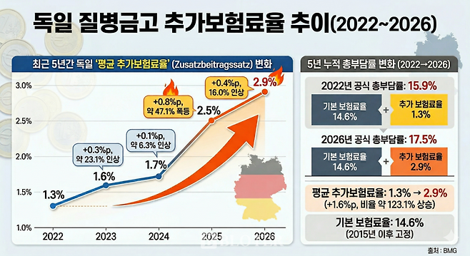 보험료 인상도 꾸준히 이뤄지고 있다. GKV 운영기관인 질병금고(Krankenkasse)가 재정 사정에 따라 추가보험료율을 자율적으로 정할 수 있도록 하면서다. 기본 보험료율은 2015년 이후 14.6%로 유지되고 있지만 실제 보험료 부담은 추가보험료를 통해 높아지는 방식이다. 지난 5년간 추가보험료율은 △2022년 1.3% △2023년 1.6% △2024년 1.7% △2025년 2.5% △2026년 2.9% 등으로 두 배 이상 뛰었다.